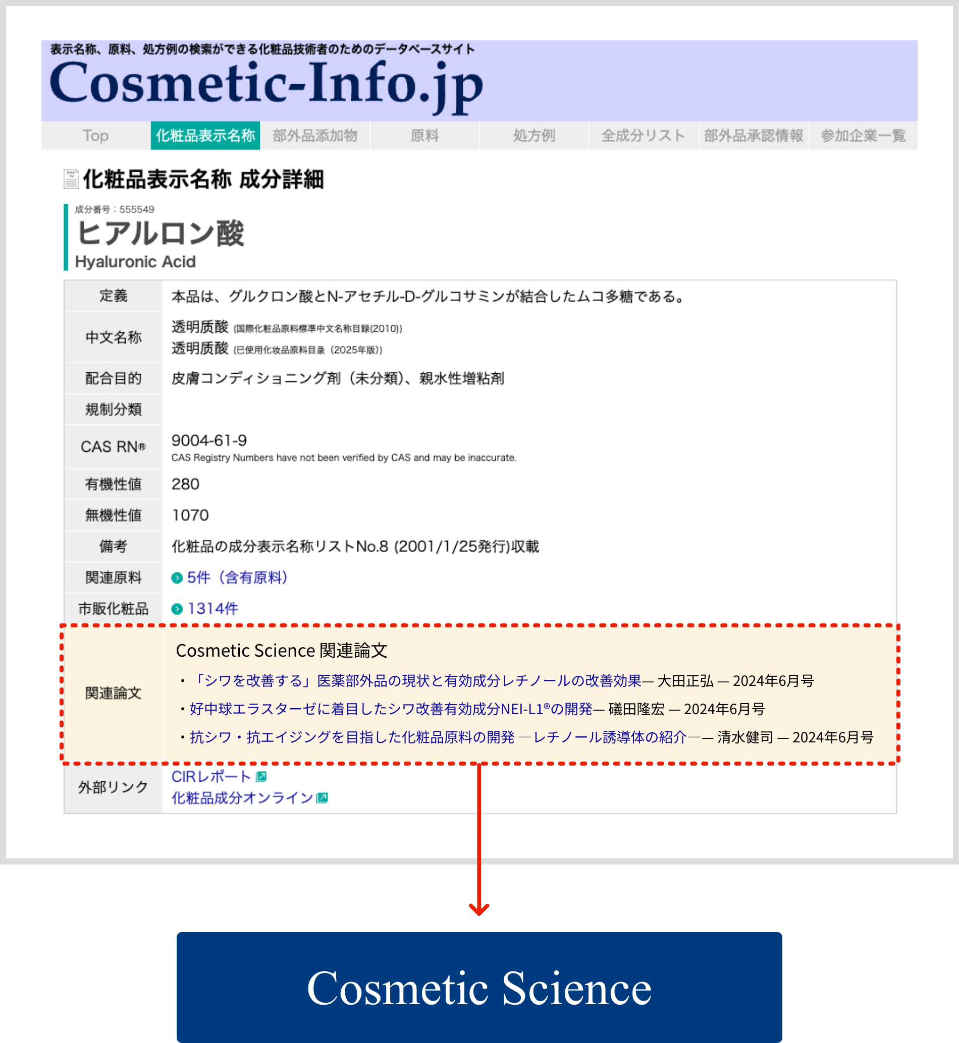 Cosmetic-Science に掲載されている各論文と、Cosmetic-Infoの成分・原料ページを相互にリンクで結び、