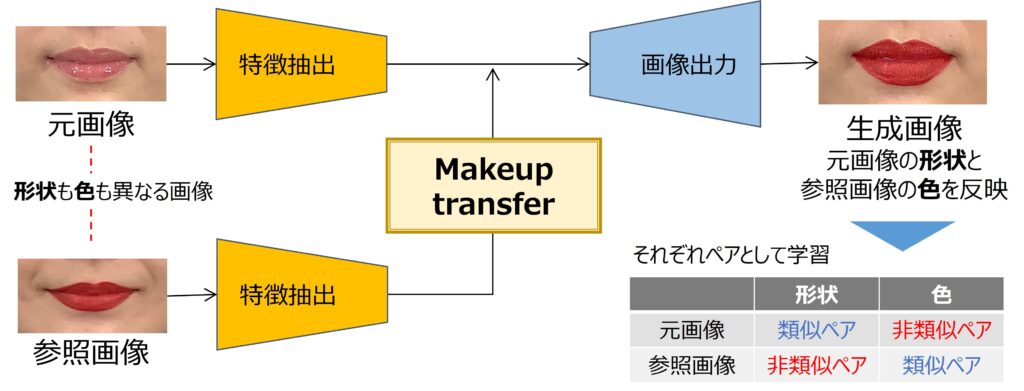 今回の「教師なし距離学習モデル」の開発では、“Makeup transfer”と呼ばれる画像生成系の技術を用いて、画像を整理するための深層学習を設計しています。この技術によって2つの画像から生成される画像を擬似的な類似ペアと非類似ペアとすることで、人手によるラベル付けをすることなく、リップメイクの形状と色を明確に分離して学習させることができます(図2)。この仕組みにより、大きさやRGB値といった一般的な指標では表しにくい“雰囲気レベルの距離の近さ=意味的な類似性”を、形状と色の2つの特徴として落とし込み、教師なし(ラベル付けなし)で画像間の距離を学習できるようになりました。その結果、リップメイク間の微細で複雑な違いを定量的に表現し、形状と色によって自動分類することが可能となりました(図1)。