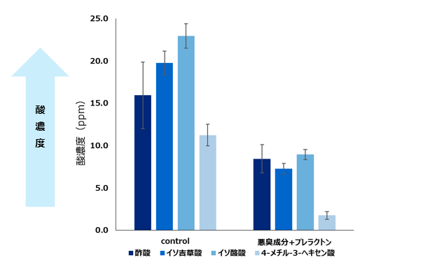 不快な皮脂や汗のニオイに起因する4種の酸(酢酸、イソ吉草酸、イソ酪酸、4-メチル-3-ヘキセン酸)を悪臭成分として選定し、プレラクトンを添加したところ、コントロール(水)を添加したものと比較して、各酸の濃度が低下することが確認されました。(図2)