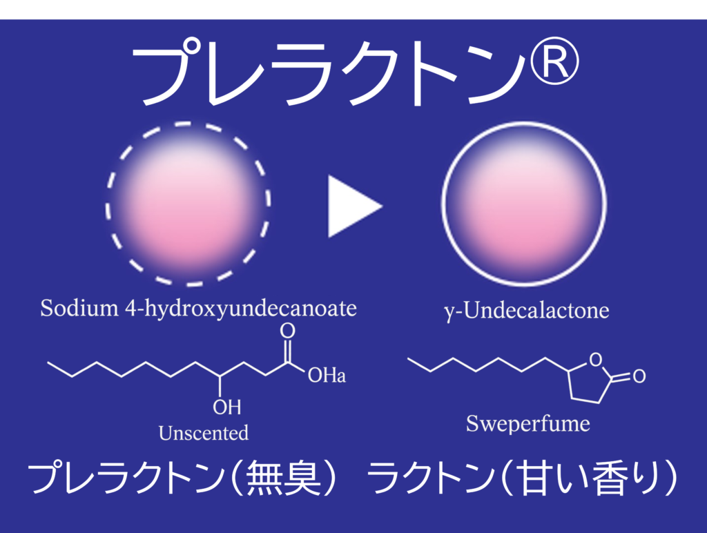 当社のこれまでの体臭研究では、女性の体臭に含まれる甘い香りを放つ成分「ラクトン」が年齢と共に減少していることを発見し、女性の年齢による体臭変化にはラクトンが関わっていることを明らかにしました※3。さらに、ラクトンの前駆体で無臭の物質、「プレラクトン」が人の肌の上でラクトンに変化することを発見し、ラクトンとプレラクトンを組み合わせることでラクトンの香りが長時間持続することを明らかにしてきました※4。