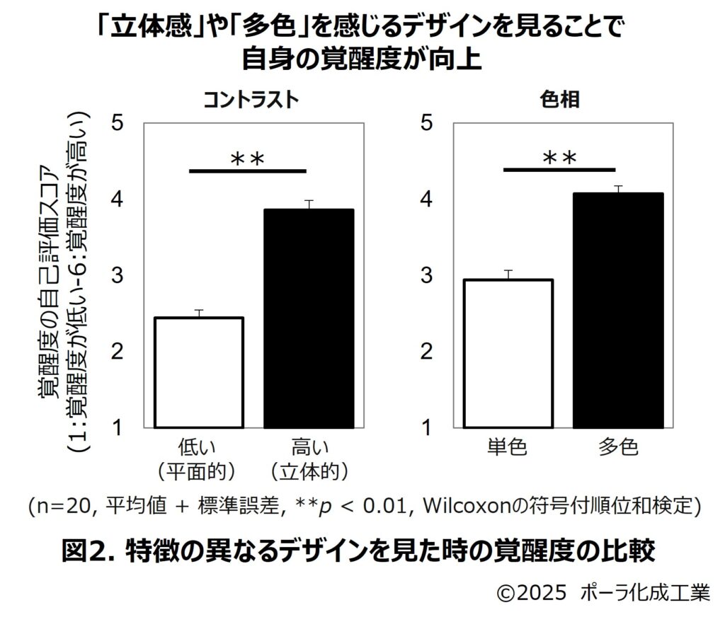 複数の心理状態の変化を検証した結果、コントラストが高く「立体感」のあるデザイン、または多彩な色相を使用した「多色」のデザインを見た際に、覚醒度の自己評価が高まることを見出しました(図2、補足資料3)。覚醒度が上がると注意力も上がり、感覚が鋭くなることで、五感で魅力を感じやすくなる可能性があります。