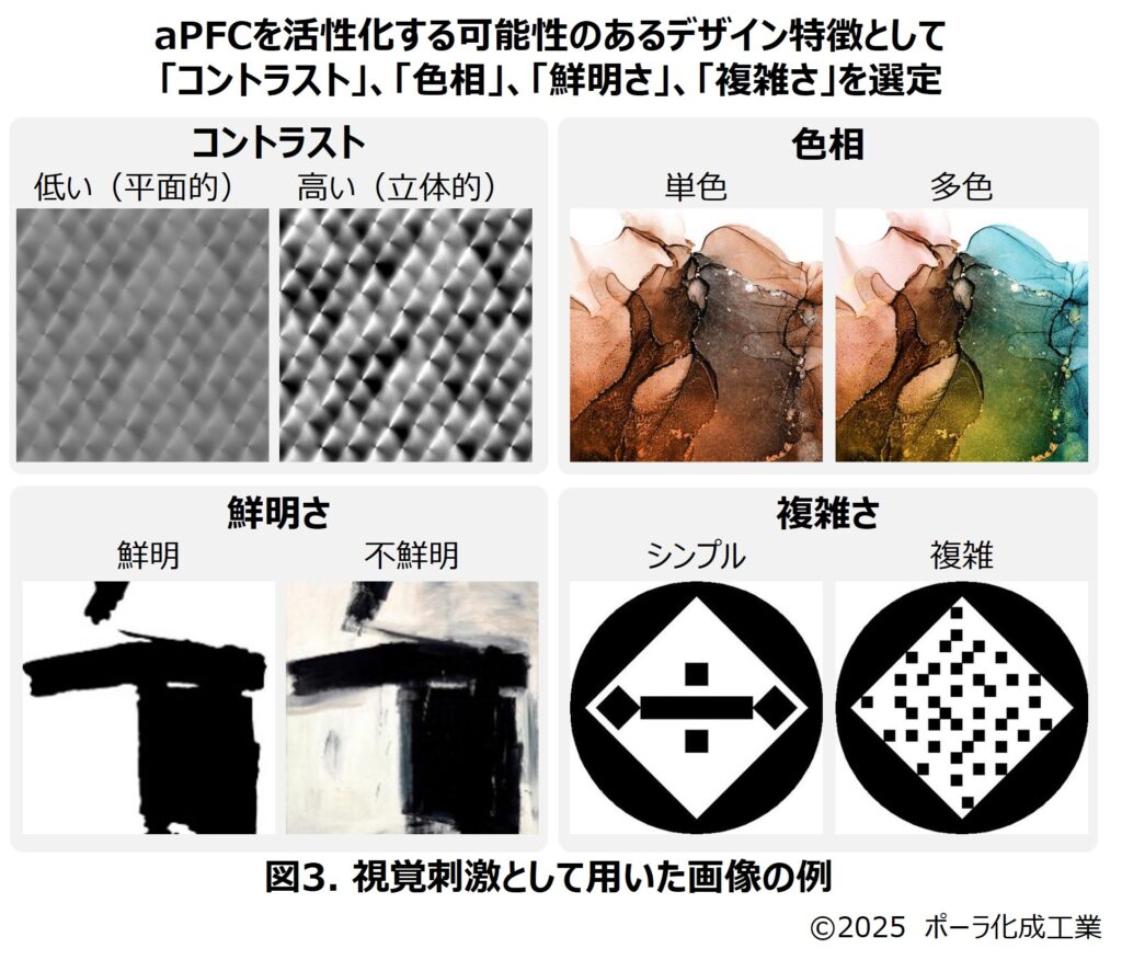 aPFCが活性化すると考えられるデザイン特徴を複数選択し、実際にそのデザインを見た時にaPFCの活性が高まるか検証しました(補足資料1、2)。その結果、コントラストが高く「立体的」なデザインと多彩な色相を使用した「多色」のデザインは、そうでないデザインと比較し、aPFCを活性化する効果が高いことが分かりました(図1)。