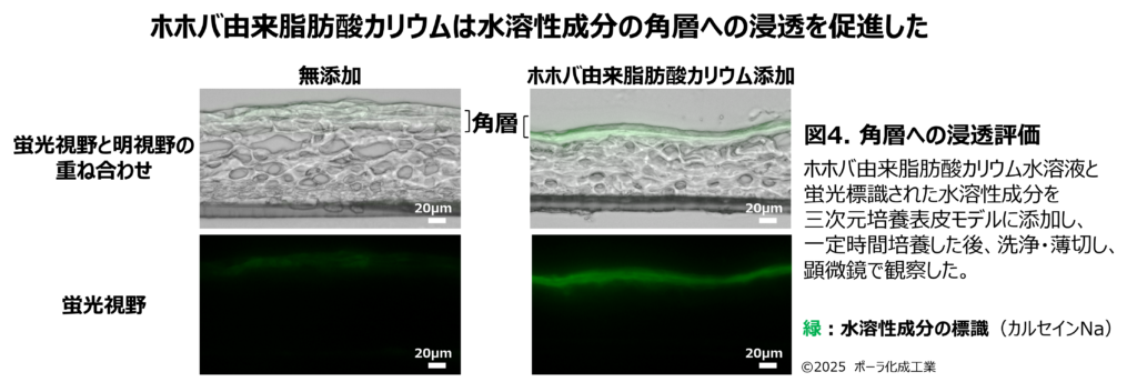 ホホバ由来脂肪酸カリウムによる角層への水溶性成分の浸透促進効果を確認しました。三次元培養表皮モデルを用いて、化粧品成分に見立てた水溶性蛍光物質の浸透性を調べた結果、ホホバ由来脂肪酸カリウムにより角層への物質の浸透が促進されることが確認されました(図4)。