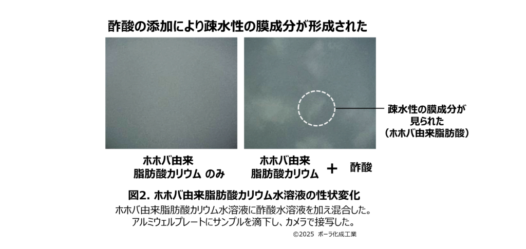 ホホバ由来脂肪酸カリウム水溶液に酢酸水溶液を添加し、攪拌すると、白い固形物が形成されます(図2)。これがホホバ由来脂肪酸カリウムと酢酸が反応してできたホホバ由来脂肪酸です。