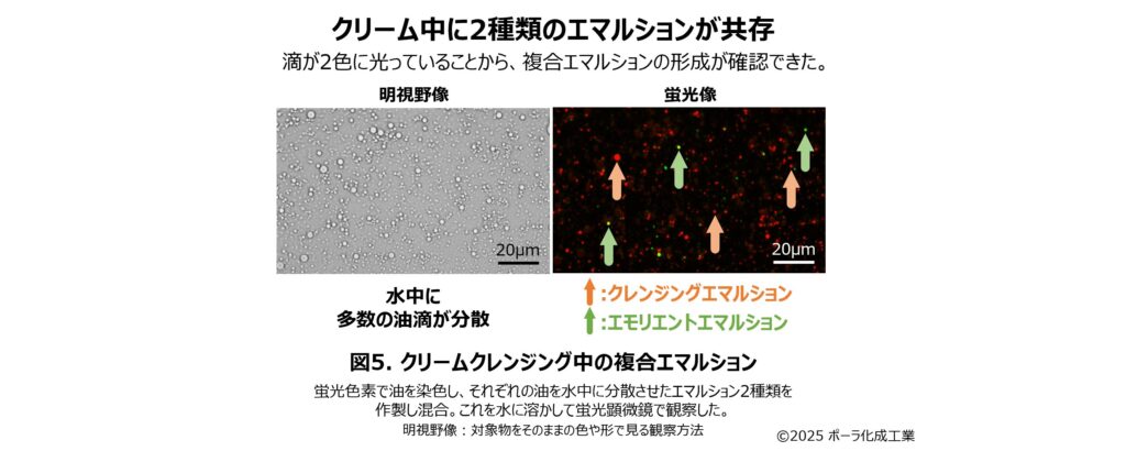 一方、今回開発したクリームクレンジングでは、水と油、そして乳化剤の配合バランスを最適化し、エマルションが均質化しにくい状態を実現しました(図4右)。