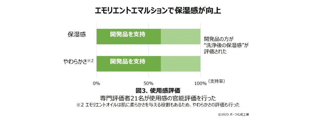 モデル実験において、開発品のクレンジング力は自社従来品と比べて明確に向上していることが確認されました(図2)。また保湿感も、専門評価者による使用感評価において高評価を獲得しました(図3)。このことから、メーク汚れをすっきりと除去しつつもエモリエントエマルションのベールを残すことに成功していると考えられます。