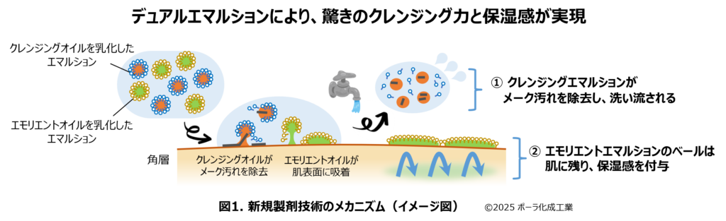 そこで着目したのが、異なるオイルからなる2つ以上のエマルション滴を1つのクリーム中に共存させる「複合エマルション※1」技術です。油分を多く含むクリームクレンジングでは複合エマルションの実現が難しいとされていましたが(補足資料1)、乳化剤を適切に使い分けることで、クレンジング用オイルのエマルションと、エモリエントオイルのエマルションを別々に、かつ安定的に共存・維持させた「デュアルエマルション」とすることに成功しました(補足資料2)。これにより、クレンジング用オイルを効率的に洗い流し、エモリエントオイルは肌に残りやすい設計が可能となりました(図1)。