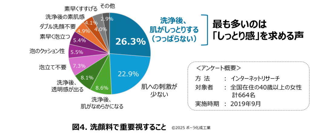 一般消費者を対象に実施した自社アンケート調査では、洗顔料に対し、「使用後の肌のしっとり感」を望む方が最も多いことが確認されました(図4)。