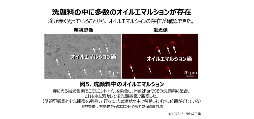 洗顔料の中にエマルションが存在しているか、また洗浄後に角層に吸着するかを検証するため、赤の蛍光色素で染色したエモリエントオイルを「Mal2Far」でくるんだエマルションを洗顔料に配合しました。