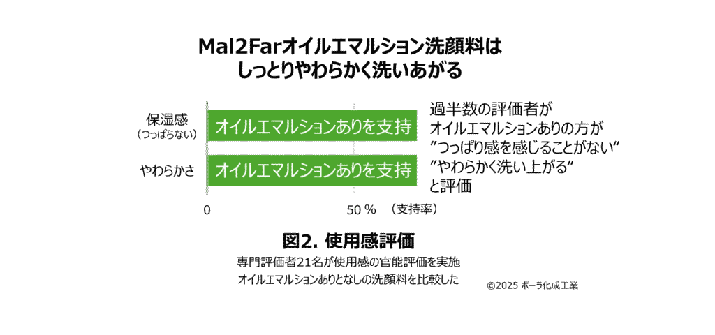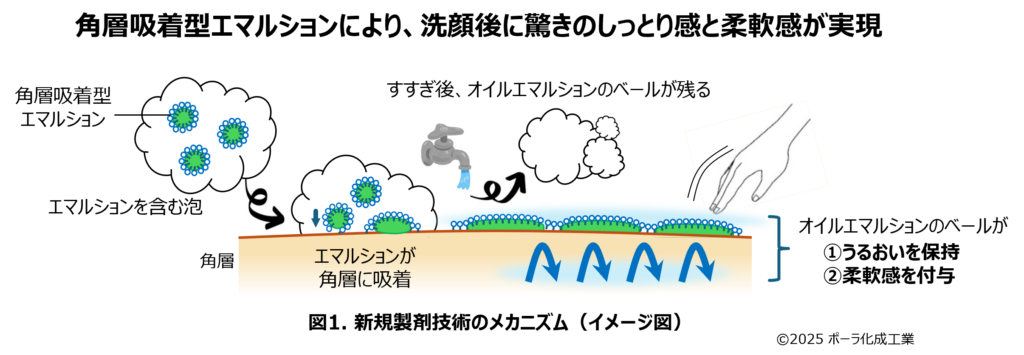 ポーラ・オルビスグループの研究・開発・生産を担うポーラ化成工業株式会社(本社:神奈川県横浜市、社長:片桐崇行)は、角層吸着性のある天然由来保水成分「Mal2Far」でエモリエントオイルを包み込み、洗顔料に安定して配合する技術を確立しました。洗顔後もエマルションとして肌にとどまり続け、高い保湿力とやわらかな手触りを実現。まるで保湿スキンケア品のような使用感を可能にします。