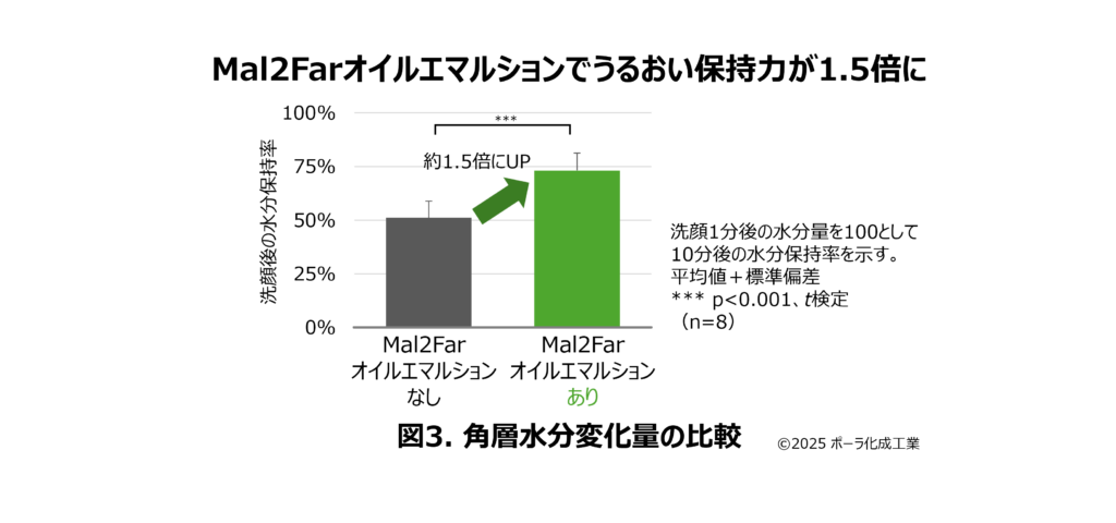 本研究では、うるおい実感をさらに向上させようと、「Mal2Far」でエモリエントオイル※2を乳化し、洗顔料に配合する新技術(角層吸着型エマルション)を開発しました。すすぎ後も肌にエマルションのベールが残ることで(補足資料2)、驚くほどのしっとり感や柔軟感を与えます(図1)。