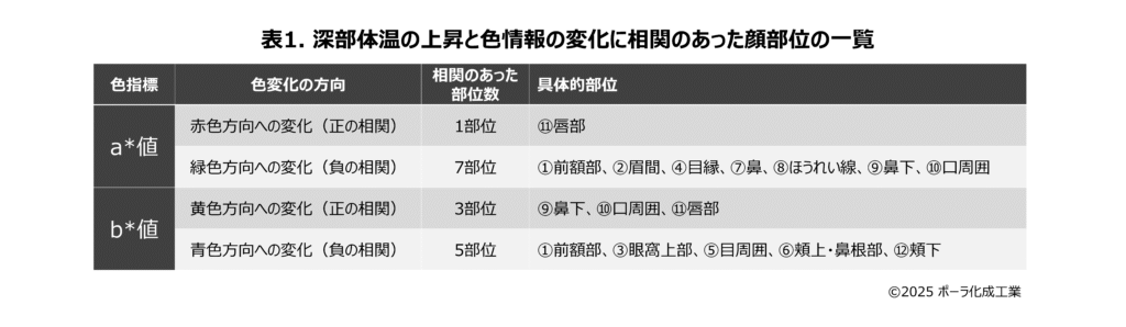 顔の複数の部位で、深部体温の上昇に伴い顔色の変化に関連(相関)があることがわかりました。また、変化する色の方向性も、部位によって異なることがわかりました。さらに、特に前額部は、他の部位よりも強く相関することが明らかとなりました(表1、図3)。