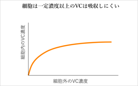 しかしながら、皮膚内に送り届けられたVCは必ずしも細胞に活用されるわけではありません。細胞が実際に細胞外から細胞内に取り込んで蓄えるVC量は、細胞外のVC濃度と完全に相関はせず、ある程度細胞外VCが高濃度になると細胞内VCの増加は頭打ちになる事がわかっていました(図2)。これは、細胞がVCの吸収と排出、酸化還元反応のバランスを制御し、細胞内のVC濃度を一定に保つ性質によるものであり、過剰なVCは細胞に入れず排出されてしまうと考えられます(図3)。