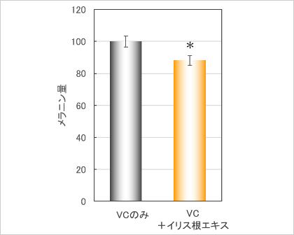 - イリス根エキスとビタミンCの相乗効果により、メラニン生成を抑制することを確認。