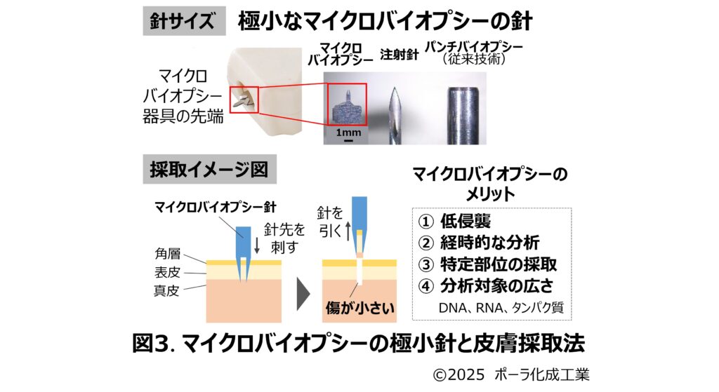 マイクロバイオプシーは、注射針よりも細い直径250 µm程度の針により、皮膚からごく少量の細胞を採取する手法です(図3)。極めて傷が小さいため従来技術のパンチバイオプシーより治りが早く、特定の部位の皮膚を経時的に採取して皮膚状態の変化を追うことも可能になりました。極小の採取面積で特定の部位だけ的確に得られることもメリットです。また、皮膚の細胞そのものが得られるので、DNAやRNA、タンパク質など多くの観点で分析することができ、より正確な皮膚内の状態・変化の把握につながります。