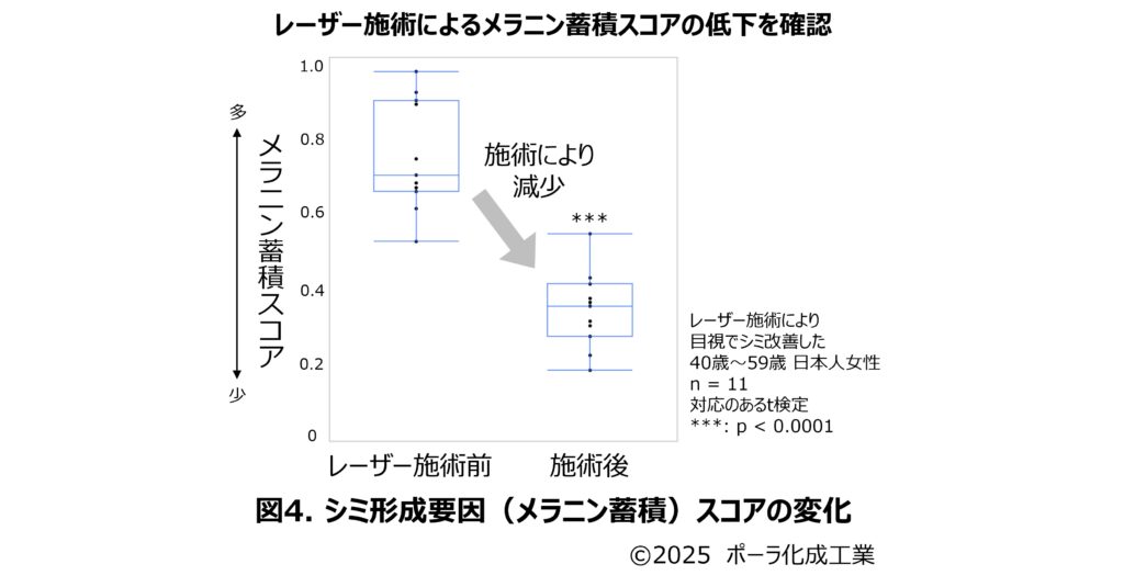 本AIシステムを用いて、レーザー施術により医師による目視でシミ改善が認められた40歳から59歳の日本人女性11名を対象に、レーザー施術前後でシミ形成要因スコアのメラニン蓄積スコアを比較した結果、施術後は施術前に比べて大きく低下しました(図4)。この結果は、シミ形成の要因となっていたメラニンを過剰に持つ表皮細胞がレーザー施術の作用で除去されたことを示唆しており、本AIシステムがシミ形成要因の推定や最適な対策の提案に有用である可能性を示します。