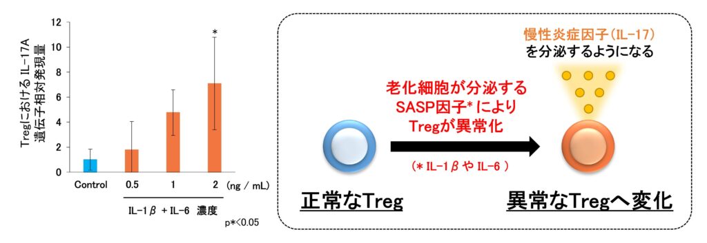老化を加速させる慢性炎症を抑制する役割を担う制御性T細胞(Treg)について、皮膚における加齢変化を解析したところ、加齢に伴い、慢性炎症因子であるIL-17を分泌する異常なTregの割合が増加することを確認しました(図3)。さらに、TregがIL-17を分泌する異常な状態へと変化する原因について検討した結果、老化細胞から分泌されるSASP因子である炎症性サイトカインIL-1βとIL-6が、TregにおけるIL-17の分泌を促進させることが明らかになりました(図4)。
