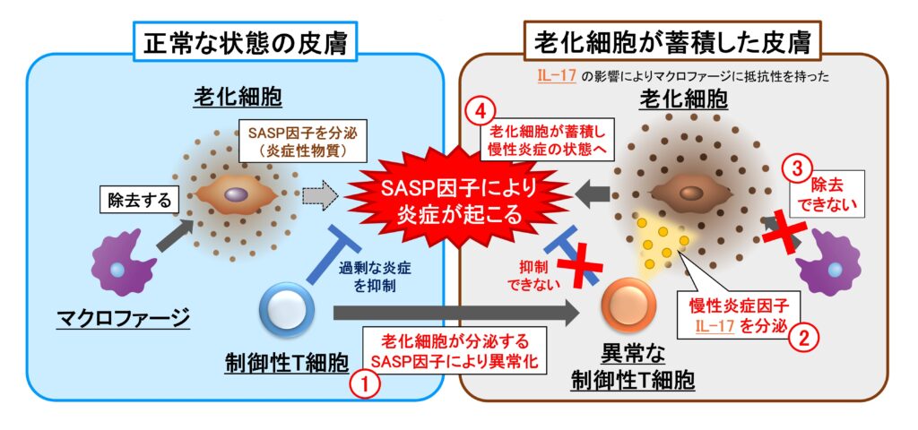 本研究では、本来は炎症を抑制する働きを持つ免疫細胞の一種「制御性T細胞(Treg)」が、加齢に伴って慢性炎症因子であるIL-17を分泌する異常なTregへと変化することを確認しました。さらに、これにより過剰に分泌されたIL-17の影響によって、マクロファージによる老化細胞の除去機能が抑制され、その結果として老化細胞が皮膚に蓄積することを発見しました。