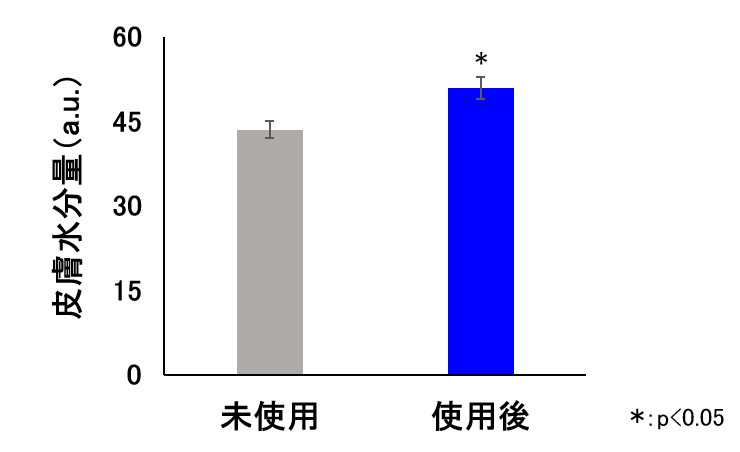 また、同じアミノ酸を配合した皮膚外用剤を11名の女性被験者(30~59歳、平均45.0歳)に1か月間使用させた結果、肌の水分量が増加することを確認しました。したがって、これらのアミノ酸は、肌の代謝活性を高め、老化による肌の機能低下を抑制すると考えられました。