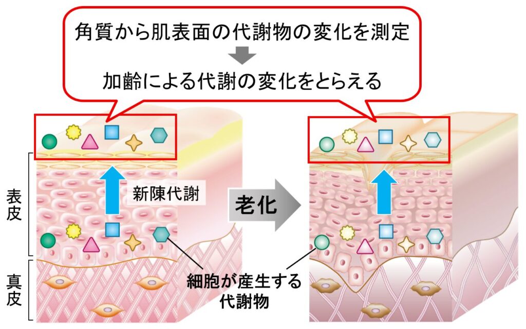 メナードは肌の角質に着目し、メタボローム解析によって老化に伴う肌の代謝の変化をとらえ、肌が衰える要因を推測することを試みました。角質細胞は、表皮の細胞(角化細胞)が新陳代謝により肌表面に押し出された細胞であるため、肌内部の代謝の状態を反映していると考えられます。