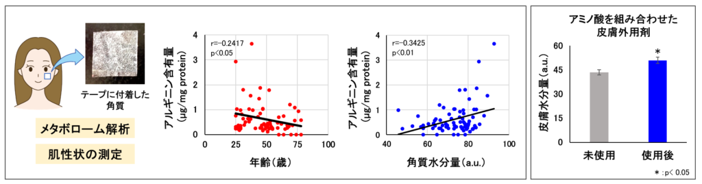 今回、20代から70代の女性の頬から粘着テープで角質を採取してメタボローム解析を行った結果、加齢に伴いアルギニンなどのアミノ酸が減少していることがわかりました。さらに、アルギニンなどのアミノ酸の量と肌の水分量に相関関係があることも見出しました。つまり、これらのアミノ酸が肌老化に関係していると考えられました。また、これらのアミノ酸を配合した皮膚外用剤を1か月間使用すると、肌の水分量が増加することも確認されました。今回見出したアミノ酸は、老化による肌の機能低下を抑制し、肌老化を防ぐ成分として期待されます。