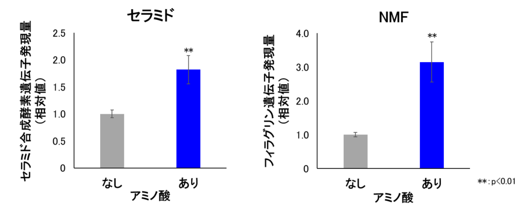 メタボローム解析で老化による代謝変化が確認された複数のアミノ酸を組み合わせ、培養角化細胞に添加した結果、保湿に関わるセラミドの合成酵素やNMF(天然保湿因子)のもととなるタンパク質(フィラグリン)の遺伝子発現量が増加しました。