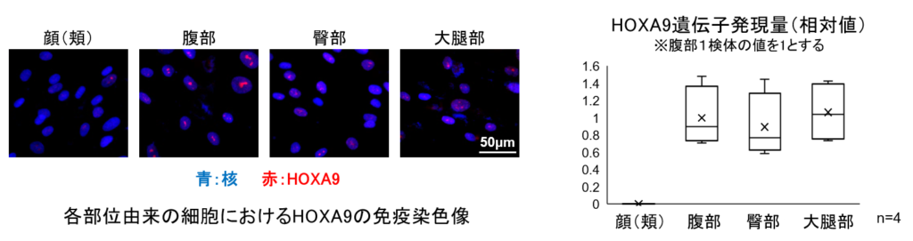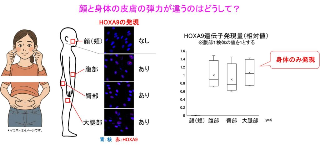 これらの結果から、身体では特異的にHOXA9遺伝子が発現していることで、顔に比べてコラーゲン、エラスチンの産生が促進され、皮膚の弾力を高めていると考えられました。