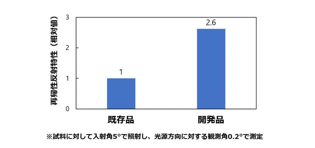 開発品と既存品のR’値を比較したとき、開発品は既存品の2.6倍の再帰性反射特性を有することを確認しました(図4)。