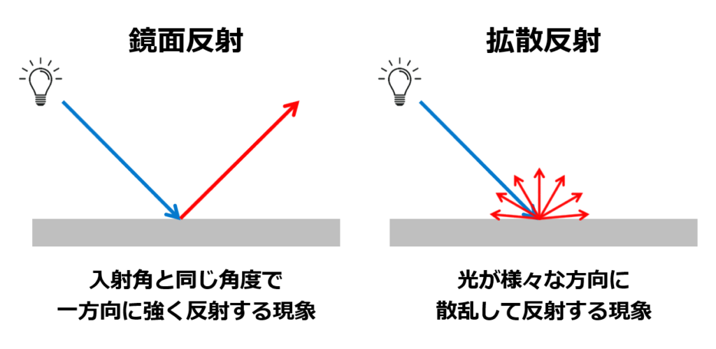 従来のメイクアップ化粧品では、主に「鏡面反射」と「拡散反射」を利用して光をコントロールし、メイクアップ効果を実現しています。鏡面反射は光を一定方向に反射しツヤや立体感を出します。拡散反射は光を様々な方向に散乱し毛穴や小ジワをぼかして、ソフトフォーカス効果をもたらします。
