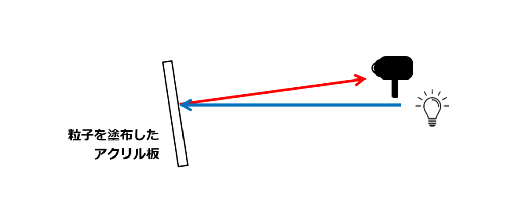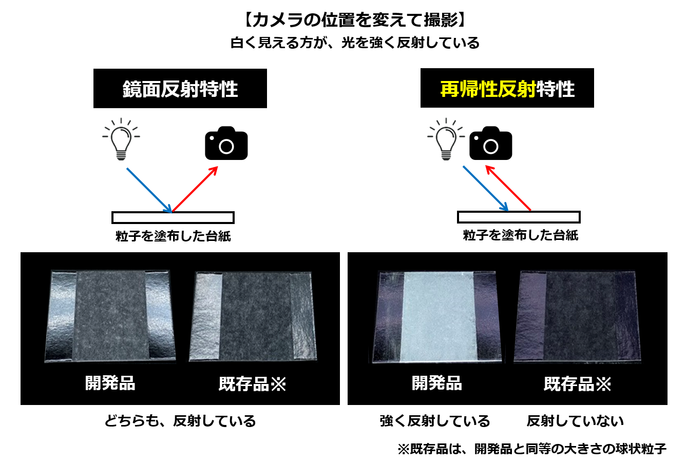 今回開発した再帰性反射特性を持つ新規な球状粒子を用いて、光の反射特性を確認したところ、既存品と同等の鏡面反射特性を備えつつ、既存品にはない再帰性反射特性をもつことが確認されました。