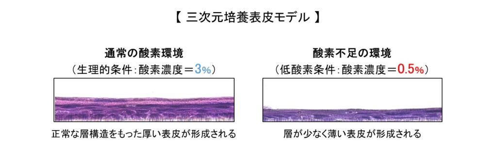 その結果、平均的な皮膚内の酸素濃度である3%の環境下では、表皮幹細胞が活発に働き、正常に表皮が再生されていることが確認できました。一方で、酸素濃度を0.5%まで低下させると、表皮の再生が大きく阻害されることが明らかになりました。