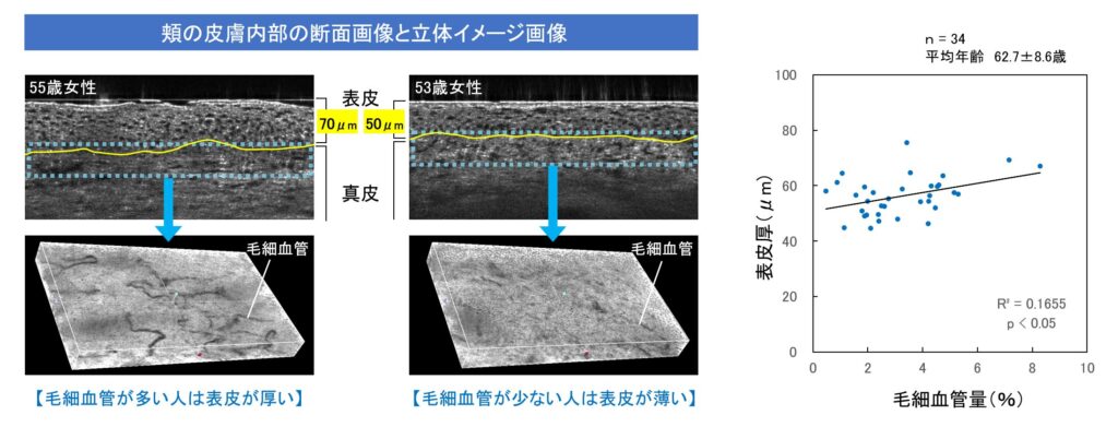 さらに、頬の皮膚内部を観察したところ、酸素を運ぶ毛細血管の量が少ない人ほど、表皮が薄い傾向にあることが確認されました。これは、加齢や生活習慣などの影響により毛細血管の機能が低下して皮膚への酸素供給が不足し、幹細胞の働きが弱まり、表皮の再生が滞っているためと考えられました。