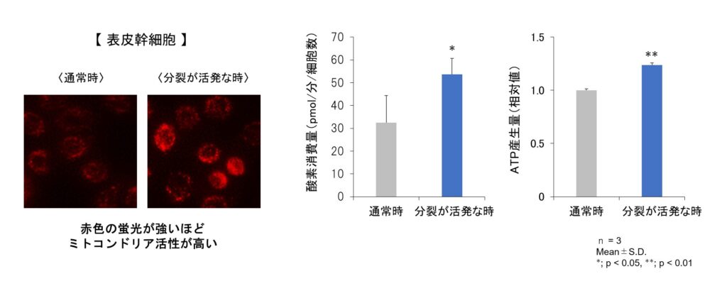表皮幹細胞が細胞分裂を行い、新しい表皮細胞を生み出すことで皮膚が再生されます。表皮幹細胞のエネルギー代謝を詳しく解析したところ、細胞分裂が活発な時ほど、細胞内のエネルギー産生器官であるミトコンドリアの活性が高まることがわかりました。さらに、分裂が活発な状態では、酸素の消費量とエネルギー源であるATPの産生量も増加することが確認されました(図3)。
