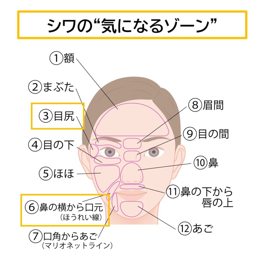 目元の肌は顔の中でも特に薄く、皮脂量が少ないため乾燥しやすく、小ジワが現れやすい部位です。さらに、鼻の横から口元にかけてのほうれい線は大きく目立ちやすいことから、老けた印象につながりやすいと考えられます。これらの部位は、シワの”気になるゾーン”であるといえます。