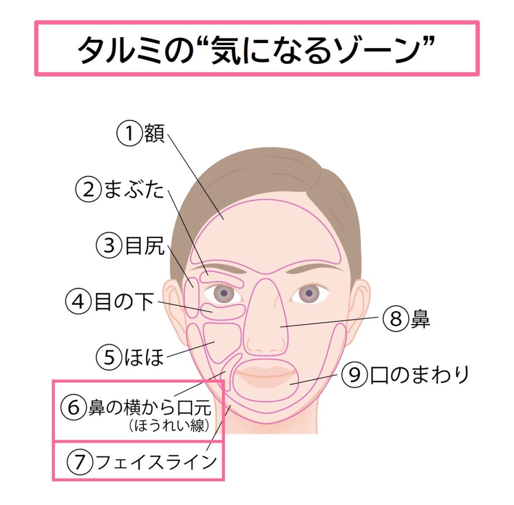 ●タルミの”気になるゾーン”は、フェイスライン、鼻の横から口元(ほうれい線)