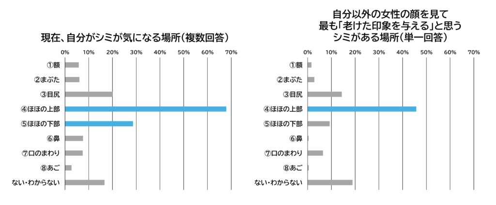 また、他の女性の顔を見て「老けた印象を与える」と思うシミの部位でも、「ほほの上部」が最多(46%)となりました。