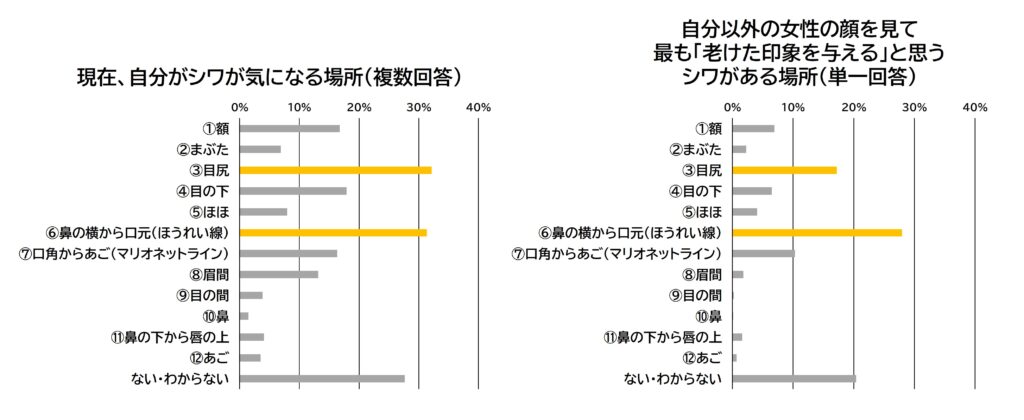 その結果、自分自身が「気になる」部位と、他人に「老けた印象を与える」部位は、ほぼ一致することが明らかになりました。