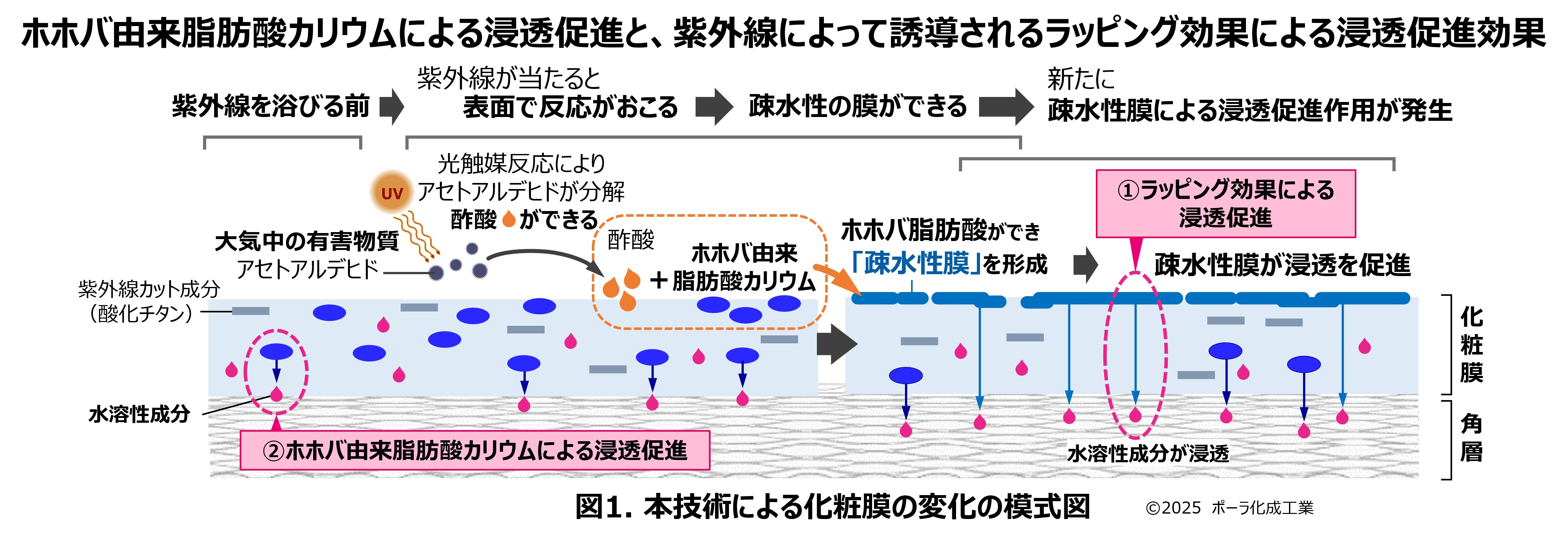 近年、口紅市場では健康的に唇を彩る血色感が重要視されています。特に自然な血色感には高いニーズがあり、これまでの口紅で重要であった発色の良さだけでなく、唇へのなじみも求められるようになってきました。そこで着目したのが化粧膜の透明性です。本研究では、鮮やかな発色と透けるような質感が得られる方法を「彩度」(色の鮮やかさ)と「透明性」を焦点として探索しました。その結果、色材の分散工程を根本的に見直すことで、少ない色材の量でも鮮やかに発色させることができ、色材の量を減らした分、透明性のある化粧膜をつくることができる分散技術「クリアカラーテクノロジー」の開発に成功しました(図1)。